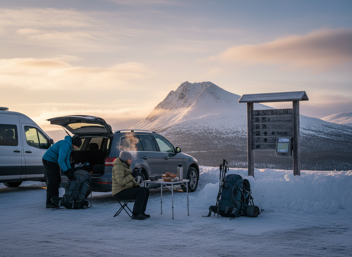 Morgen: Frühes Frühstück und Fahrt zum Parkplatz Gaustatoppen. am Gaustatoppen Parkplatz (1 Stunde)