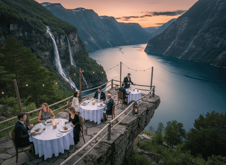 Reisen Sie zum ikonischen Geirangerfjord und genießen Sie Gourmet-Dining mit atemberaubendem Fjordblick.